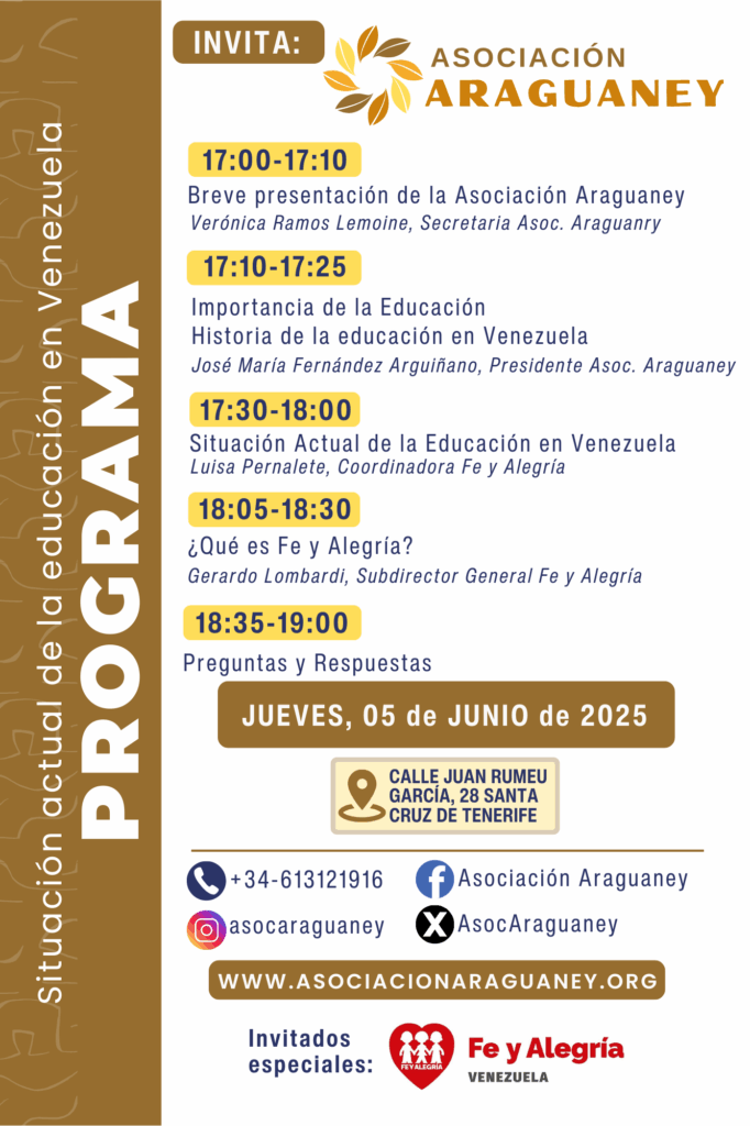 Somos más de 8 millones de venezolanos fuera de Venezuela y muchos millones más de amigos del país a quienes nos importa la situación de la educación. Hay una organización que todos conocemos y que cumple 70 años trabajando por la educación en Venezuela: Fe y Alegría. De una manera muy sencilla podemos colaborar comprando la rifa desde cualquier lugar del planeta en este link: https://rifa.feyalegria.org/tickets-init Pero si estás en Tenerife, también puedes asistir a la jornada de información sobre la situación de la educación en Venezuela y conocer de la mano de nuestros invitados la labor de Fe y Alegría en Venezuela y sobre tu contribución mediante la compra de boletos de la tradicional Rifa de Fe y Alegría.